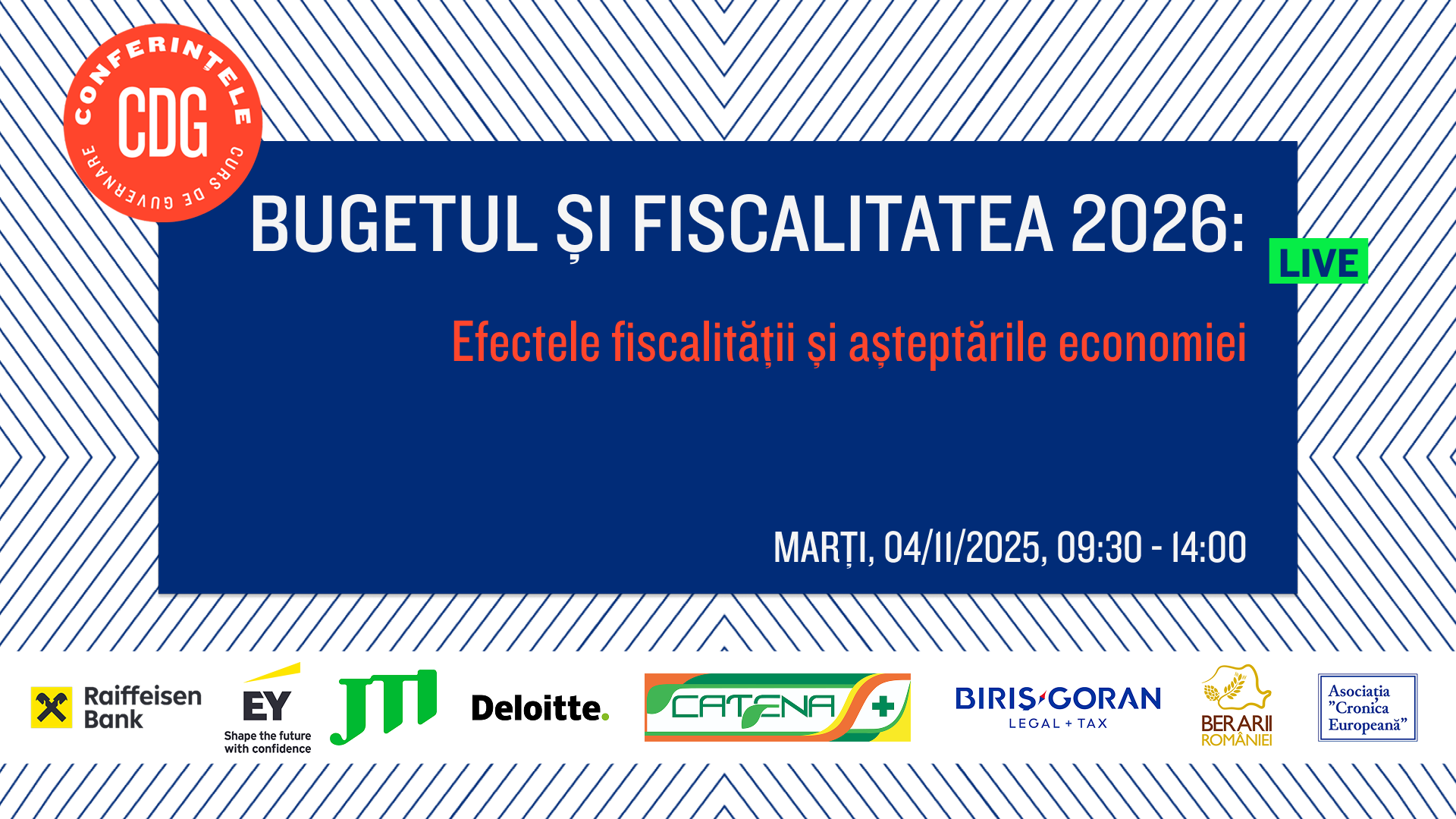 Marți, 4 noiembrie, CursDeGuvernare organizează conferința „Bugetul și fiscalitatea 2026: Efectele fiscalității și așteptările economiei” – un eveniment dedicat dezbaterii priorităților și deciziilor care vor defini construcția bugetului pentru anul viitor.